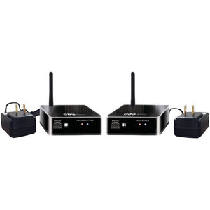 Enables wireless hookup for powered subwoofers & powered speakers; Works with A/V receivers, Mac(R), PC, mobile devices & all other products with 3.5mm or RCA connectors; External antennas enable extended 80ft unobstructed wireless range & up to 60ft obstructed; 4 selectable channels; Wireless 20Hz-20kHz; Signal-to-noise: 93dB; RF band: 2.4GHz; Includes self-adhesive VELCRO(R) strips, transmitter, receiver, 2 external antennas, 2 USB AC power adapters, 2 USB cords, 2 RCA to RCA stereo patch cables, 2 RCA Y-adapter cables & two 3.5mm stereo to RCA cables; 1-year warranty;